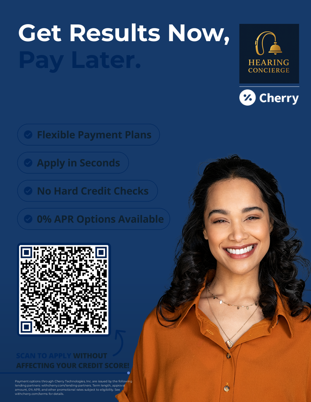 We are thrilled to offer flexible payment plans through Cherry! We believe you should have the freedom and peace of mind to focus on your hearing health first, without worrying about upfront costs.
